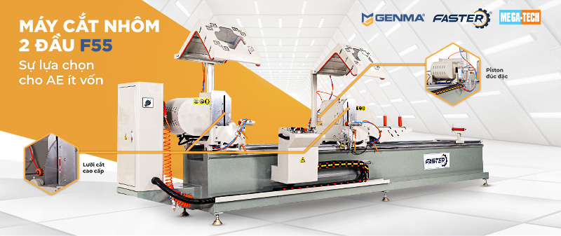 - Máy cắt nhôm 2 đầu F55 là dòng máy thế hệ mới với công suất 1.5Kw. Sản phẩm sẽ thích hợp với các xưởng sản xuất cửa nhôm có khối lượng công việc vừa phải.