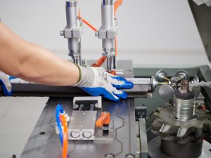 Bước 4: Đưa thanh nhôm vào, ấn nút “Kẹp phôi” để piston kẹp cố định hoàn toàn phôi.